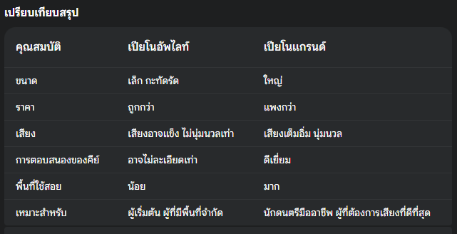 ข้อเสีย:เสียงอาจไม่เต็มและนุ่มนวลเท่าเปียโนแกรนด์